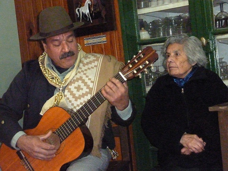 Le Payadore qui anime le lieu a un talent d’improvisation extraordinaire : dès que quelqu’un arrive, il lui pose trois questions d’un air anodin, et improvise dans la seconde une petite chanson, bien en rapport avec la personne, mais finissant toujours à chaque fin de strophe par une petite phrase humoristique qui déclenche l’hilarité générale. J’y ai droit immédiatement, et ayant sans doute une bonne tête, une deuxième chansonnette m’est immédiatement dédiée. Je vous les livre ici, sauf le tout début de la première, la rapidité de réaction du Payadore ne m’ayant pas laissé le soin d’armer mon appareil ! Gilda rie aux larmes...